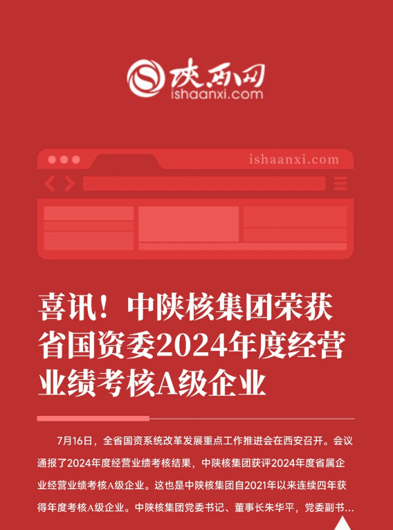 【陕西网】喜讯!中陕核集团荣获省国资委2024年度经营业绩考核A级企业 发布于:2025-07-17 15:11 来源:中陕核工业集团