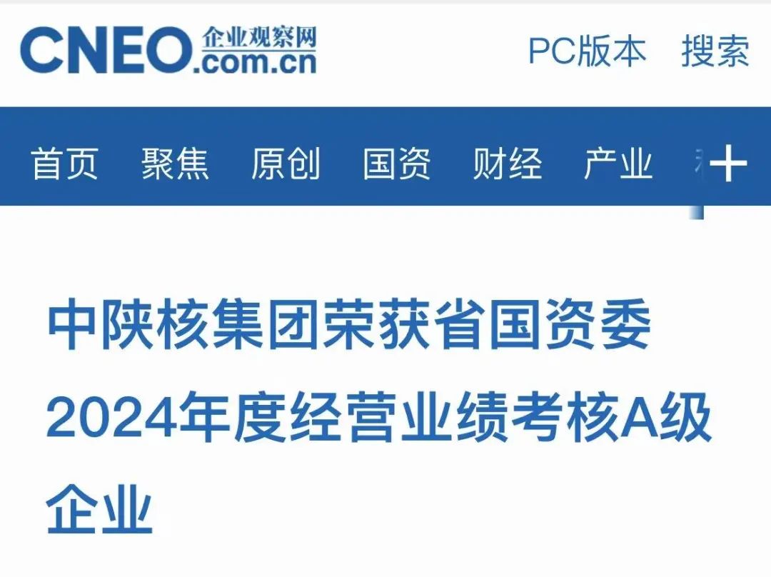 【企业观察网】中陕核集团荣获省国资委2024年度经营业绩考核A级企业