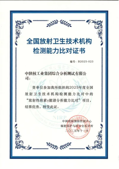 近日,中国疾病预防控制中心辐射防护与核安全医学所召开2025年度全国放射卫生技术机构检测能力比对总结会,正式公布考核结果。在全国64家参与放射性核素γ能谱分析能力比对的机构中,中陕核测试公司凭借精准的检测技术、严谨的分析流程及可靠的结果数据,成功跻身19家优秀机构行列,成为陕西省内唯一获此殊荣的单位,充分彰显了公司在放射卫生安全监测领域的过硬实力。