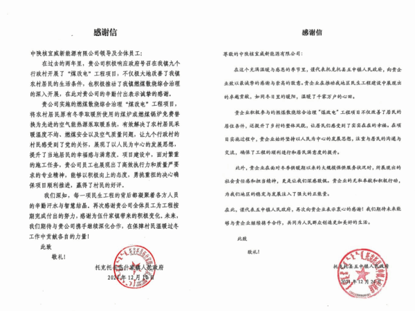 在感谢信中,两镇人民政府对宜威公司在推动地区民生工程建设中的贡献给予高度赞誉,称其“如同冬日暖阳,温暖了千家万户的心田”。
