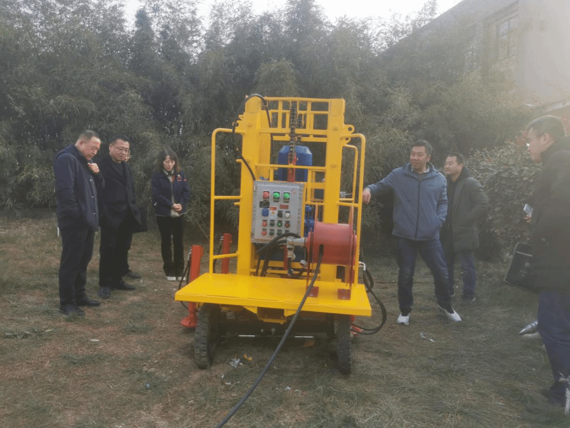 首先,参观了电液一体化螺旋地锚设备,项目组详细介绍了改进部位、操作要领以及升级后的设备优势,并现场进行了遥控操作、转向移动、地锚打孔等演示。