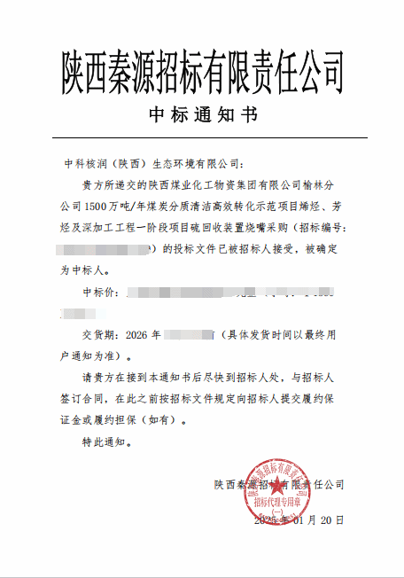 新年伊始,战鼓催征。生态公司紧盯市场全面布局,以“起步即冲刺,开局即决战”的奋斗姿态中标新年开门红。中科核润(陕西)生态环境有限公司成功中标陕西煤业化工物资集团有限公司榆林分公司 1500 万吨/年煤炭分质清洁高效转化示范项目烯烃、芳烃及深加工工程一阶段项目硫回收装置烧嘴采购项目。该项目是公司首个在煤化工行业承接的大型设备采购类项目,突破了公司以往传统业务范畴,开辟了公司在煤化工行业领域全新的业务版图。
