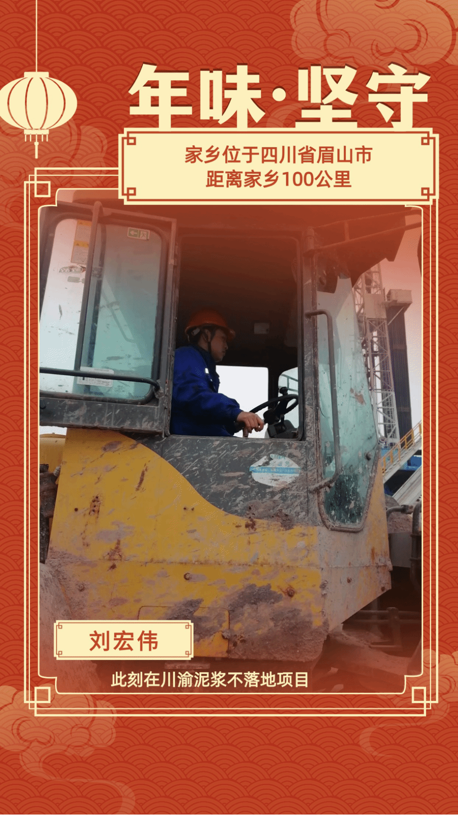 刘宏伟,此刻在生态公司川渝泥浆不落地项目,家乡位于四川省眉山市,距离家乡100公里。今年春节我在岗,我的岗位是装载机操作工,负责操作装载机转运岩屑工作,保证井队生产顺利进行。