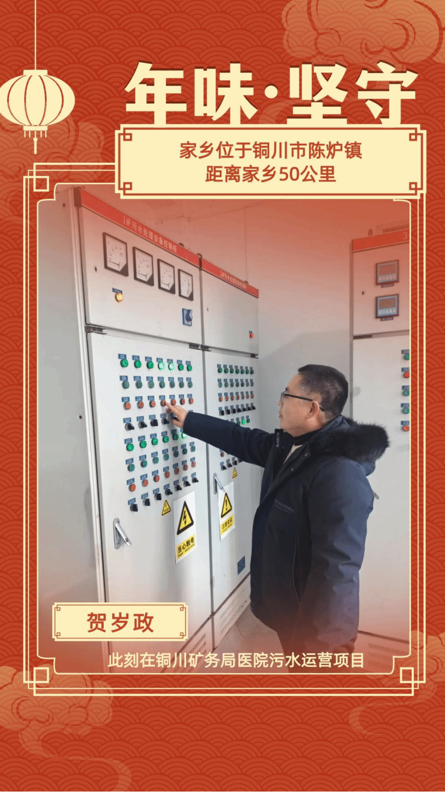 贺岁政,此刻在生态公司铜川矿务局医院污水运营项目,家乡位于铜川市陈炉镇,距离家乡50公里。今年春节我在岗。我的岗位是污水处理运营操作员,负责污水消毒工作,保证所有设备过年期间顺利运行。