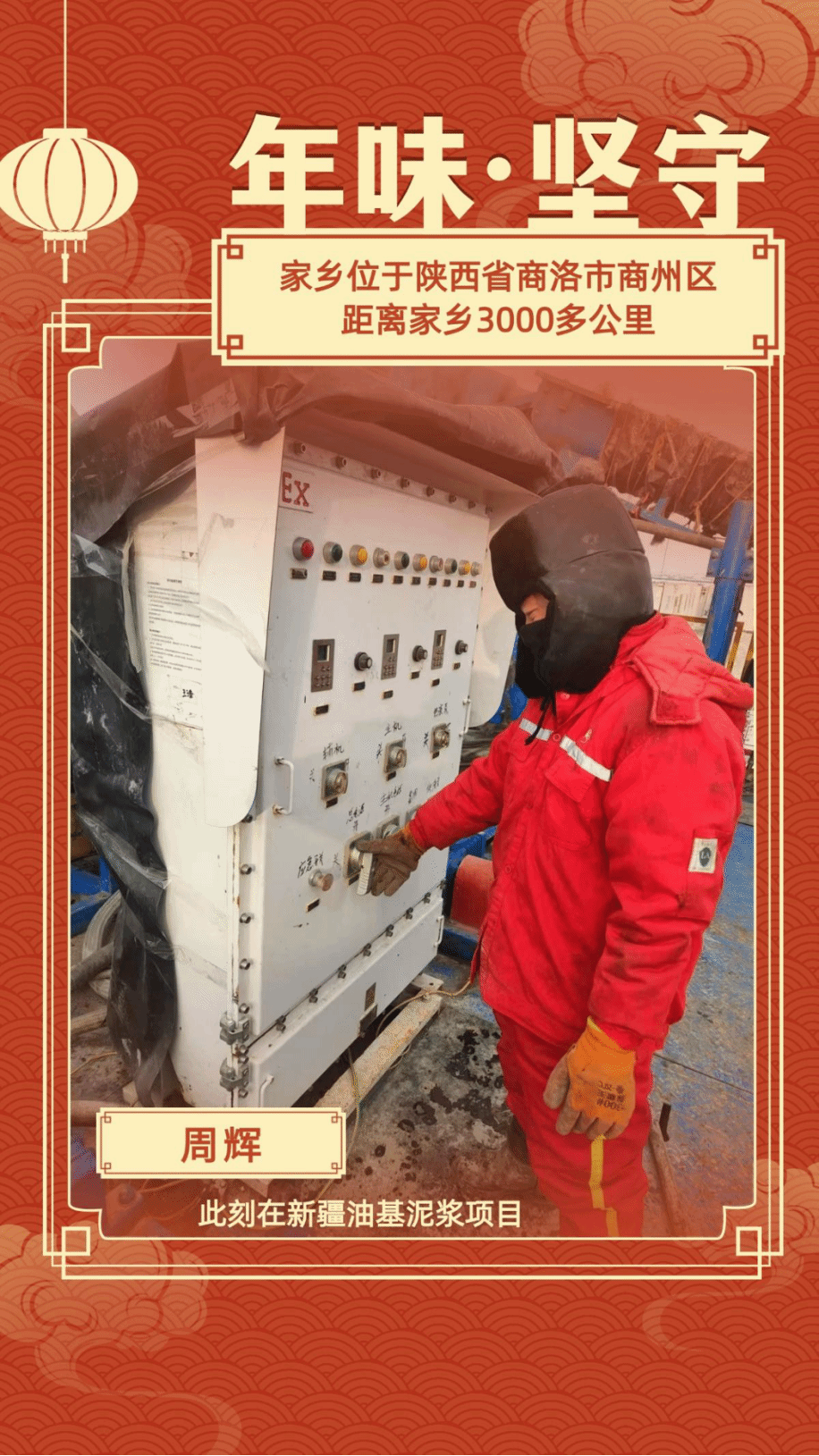 周辉,此刻在生态公司新疆油基泥浆项目,家乡位于陕西省商洛市商州区大荆镇,距离家乡3000多公里。今年春节我在岗,我的岗位是操作工,负责项目运行设备正常工作,保证离心机等设备顺利运行。