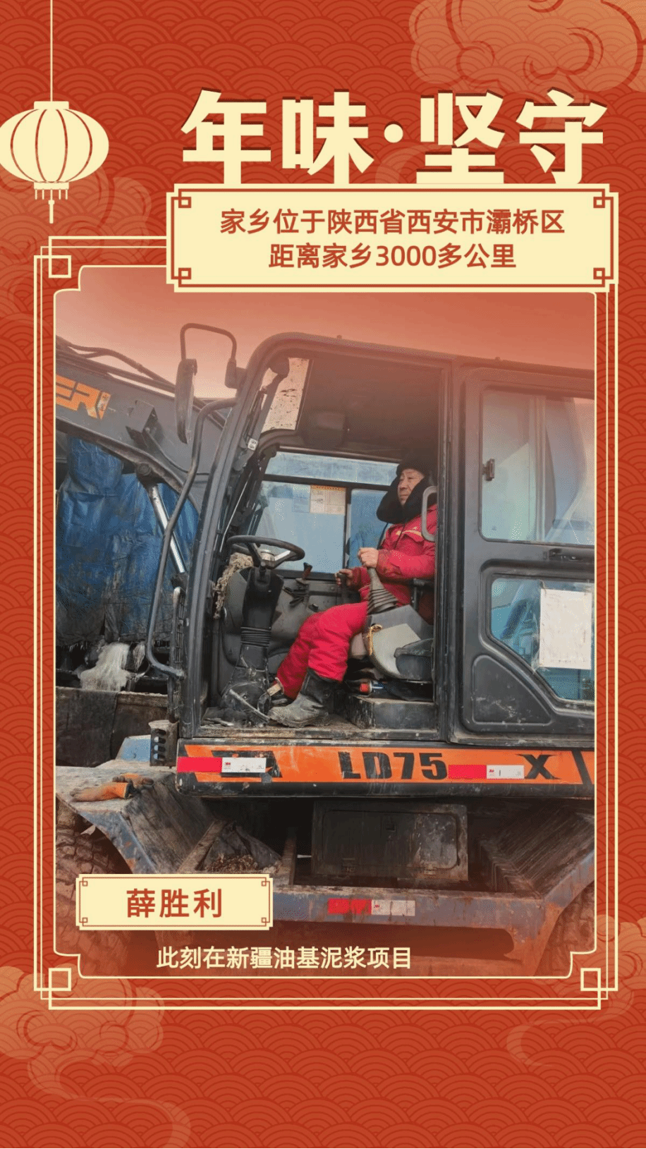 薛胜利,此刻在生态公司新疆油基泥浆项目,家乡位于陕西省西安市灞桥区,距离家乡3000多公里。今年春节我在岗,我的岗位是挖掘机驾驶员,负责操作挖掘机工作,保证项目现场挖掘机设备顺利运行。