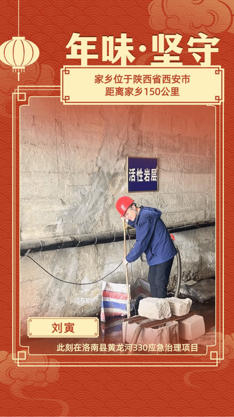 刘寅,此刻在生态公司洛南县黄龙河330应急治理项目,家乡位于陕西省西安市,距离家乡150公里。今年春节我在岗,我的岗位是项目经理,负责项目现场安全生产管理工作,保证春节期间安全运行。
