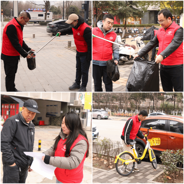 活动当天,公司党员志愿者身穿红马甲,手持夹钳、垃圾袋,分组对社区主干道、绿化带及休闲广场展开“地毯式”清扫。大家重点清理烟头、塑料袋、废弃包装等混合垃圾,并现场进行分类。同时为提升居民垃圾分类意识,大家分组发放《垃圾分类实用指南》宣传册,宣传册以图文形式详解四分类标准、投放时间及碳减排关联知识。针对电动车乱停乱放堵塞通道、影响安全等问题,志愿者们对楼前屋后散落的电动车、自行车统一挪移至划线停车区,确保消防通道畅通。