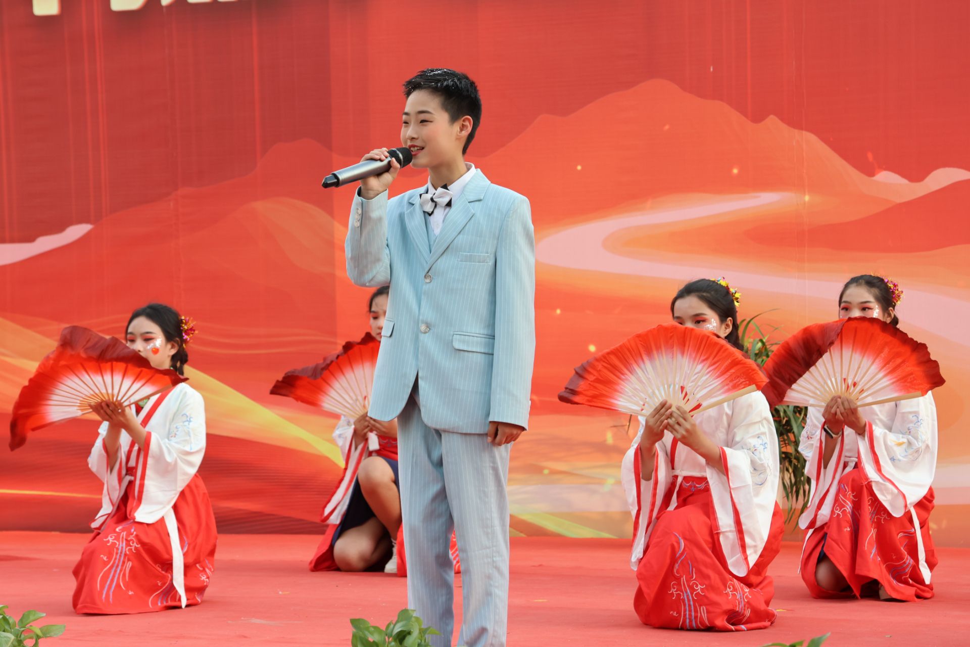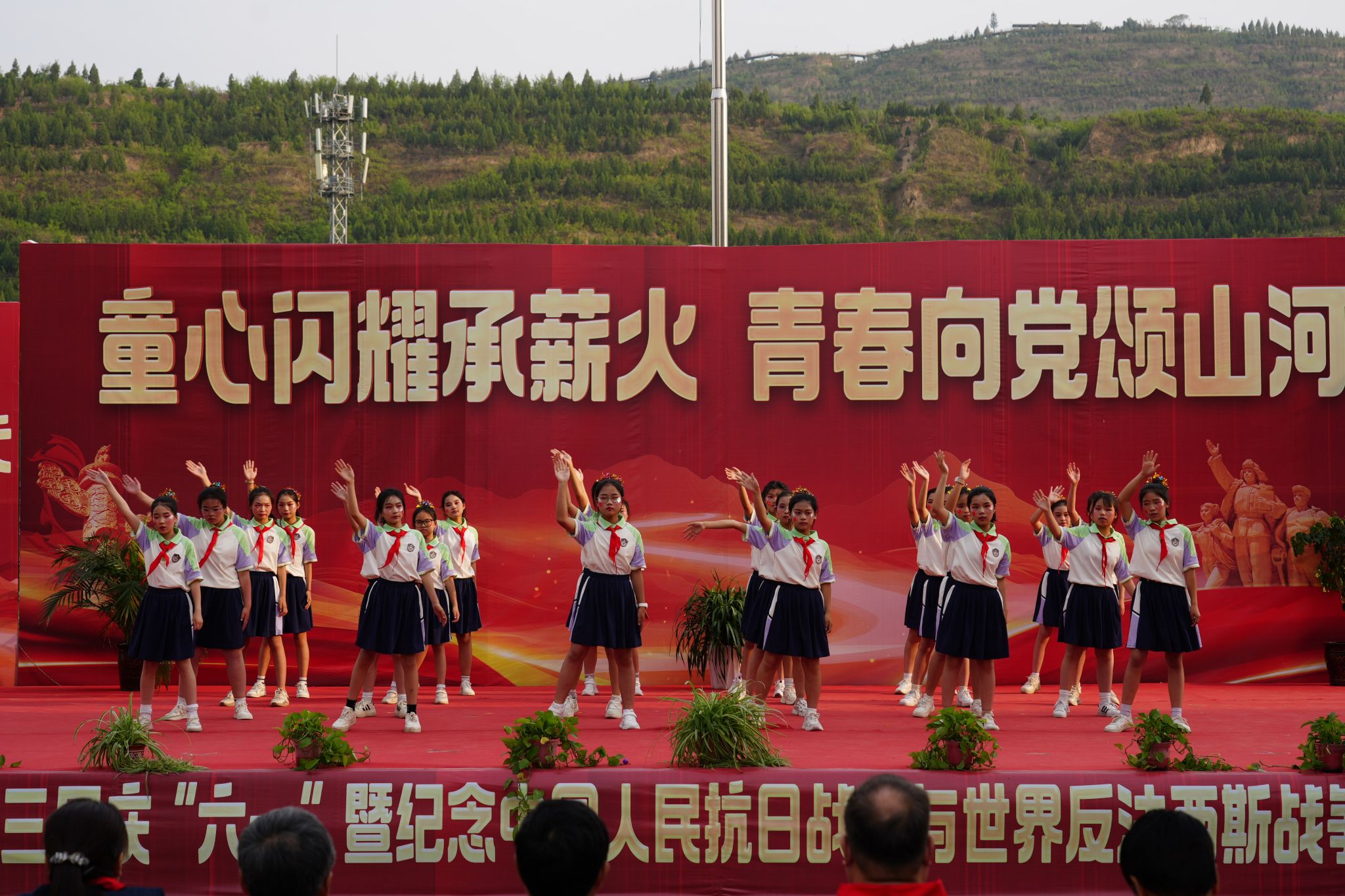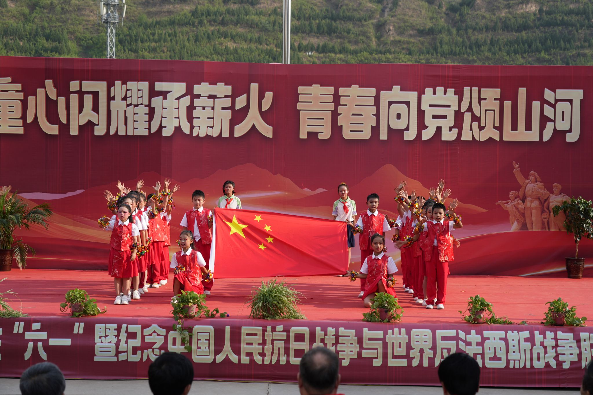 5月23日下午,为迎接即将到来的六一国际儿童节,“庆‘六一’暨纪念中国人民抗日战争与世界反法西斯战争胜利80周年” 文艺汇演在潼关县秦东镇滨河小学举行。陕西省慈善协会副会长张文亮,中陕核集团总工程师、院党委书记、院长燕建龙,渭南市慈善协会副会长胡寿文,潼关县副县长王江涛,潼关县慈善协会会长王乔,潼关县教体局党委书记、局长李军亮,副院长李运军、樊丽萍、席鹏等领导嘉宾齐聚现场,与滨河小学全体师生及家长共同度过一个难忘而有意义的节日。