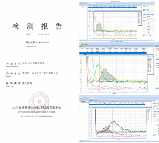 为进一步验证产品主要性能的权威性与可靠性,HFMT水文流量监测仪在大庆石油测井技术检测实验中心开展水文流量检测。该中心作为石油测井领域的权威检测机构,严格依据行业标准及检测规范,对仪器在油管、套管、环空不同管柱条件下的水文流量参数进行了全面测试并出具了权威检测报告。最终检测结果显示,HFMT水文流量监测仪关键指标均符合设计要求,判定达标,充分印证了其在实际井下作业场景中的适配性与稳定性,为公司在核地质勘探装备制造及业务推广方面打下坚实基础。