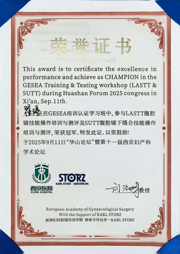 在腹腔镜GESEA培训项目中,翟瑶医生凭借扎实的理论基础、娴熟的操作技巧和稳定的临场发挥,从众多选手中脱颖而出,荣获第一名,充分体现了我院医生在微创手术领域的深厚积淀。