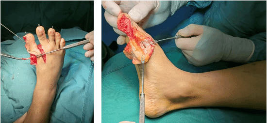 在完成骨骼的“硬支撑”重建后,手术团队将切除下来的副趾上的肌腱,通过皮下隧道,精准地转位至大脚趾外侧,并加强缝合,动态平衡了导致内翻的软组织力量,为大脚趾恢复了正常的外翻力量,从根本上确保了矫形效果的长期稳定。