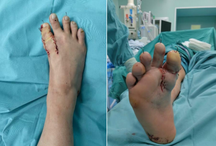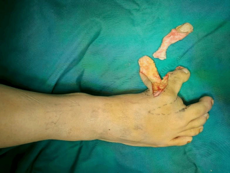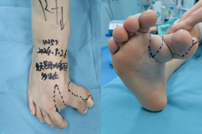 手术开始便迎来了第一个挑战,由于畸形足趾的血管走行常异于常人,术中一旦损伤趾动脉,将导致足趾缺血坏死,造成灾难性后果。为此,团队术前特意为患足做了血管彩超,精准绘制出“血管地图”,从而在手术中完美避开了重要血管,确保了术后足趾的血运安全。