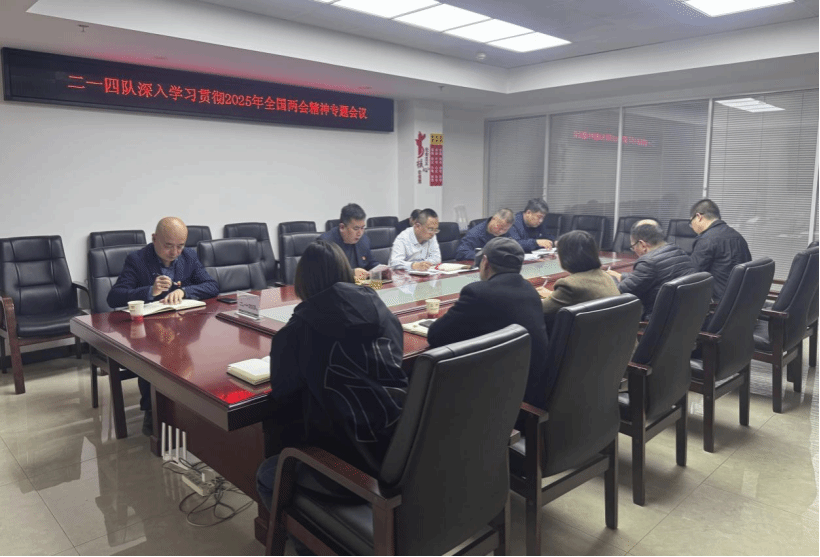 3月20日下午,中陕核二一四队党委组织召开深入学习贯彻2025年全国两会精神专题会议,认真学习习近平总书记在全国两会上的重要讲话,传达学习十四届全国人大三次会议和全国政协十四届三次会议精神,结合公司工作实际,研究部署贯彻落实措施。二一四队党委书记、董事长付星主持会议。
