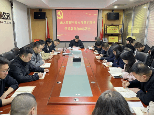 会议深入学习了习近平总书记关于中央八项规定的部分重要论述,传达学习了中共中央办公厅印发的《关于在全党开展深入贯彻中央八项规定精神学习教育的通知》《中央政治局关于改进工作作风、密切联系群众的八项规定》和《中央政治局贯彻落实中央八项规定实施细则》,对公司开展深入贯彻中央八项规定精神学习教育进行了安排部署。