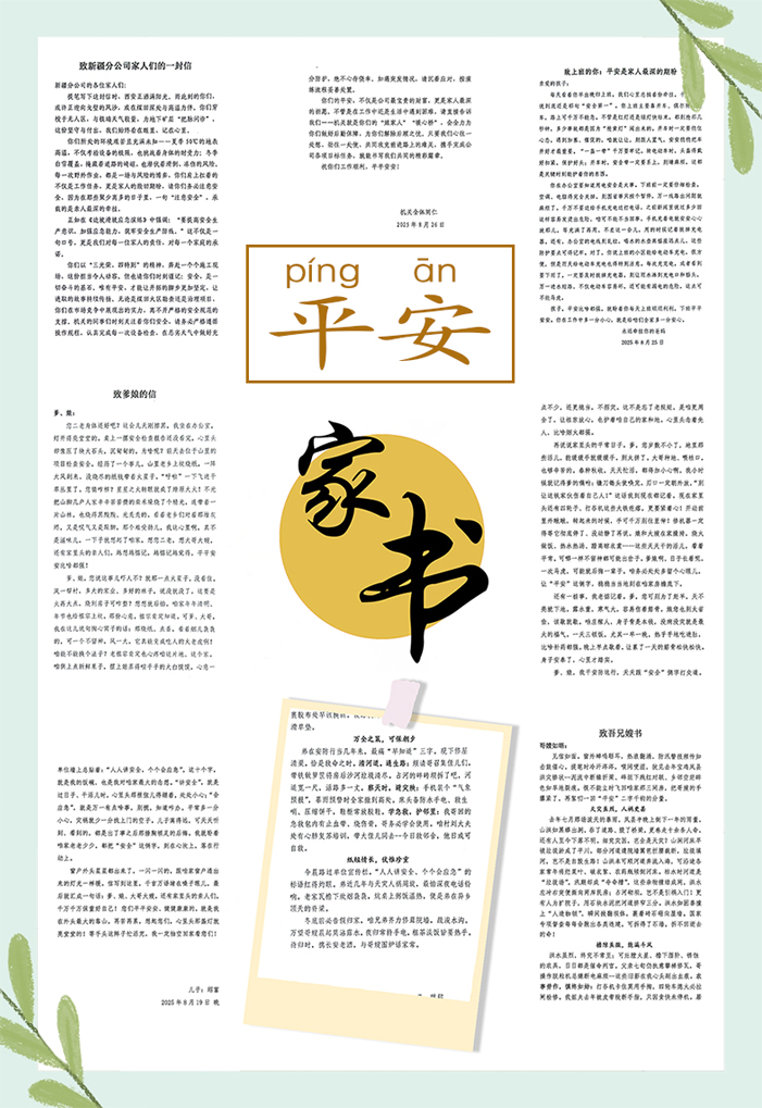 为促进安全生产与健康生活的理念深入职工家庭,营造“人人讲安全、个个会应急、家家享健康”的良好氛围,公司工会于8月组织开展了以“家企同心筑防线,安康幸福伴我行”为主题的安全家书征集活动。
