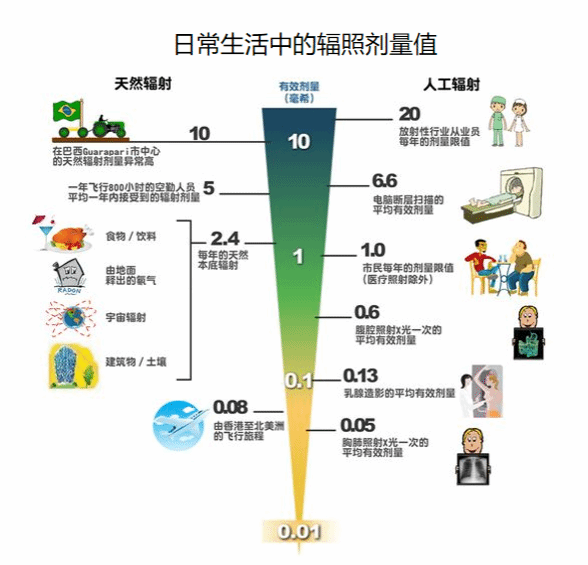 对普通人来说,每年的正常环境本底辐射摄取量是每年1~2毫希弗,日常生活中的食物饮品、来自天空的宇宙射线等都会产生天然本底辐射。