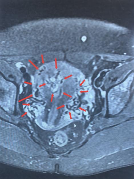 检查结果很快传来,B超结果显示宫腔内残留组织伴丰富血流,高度怀疑“子宫动静脉瘘”;随后的MRI检查进一步证实,患者宫腔内不仅有异常病灶,邻近子宫前壁还出现多发流空信号——这意味着子宫动脉与静脉之间形成了异常通道,动脉血直接涌入静脉,一旦通道破裂,就可能引发难以控制的致命性大出血。