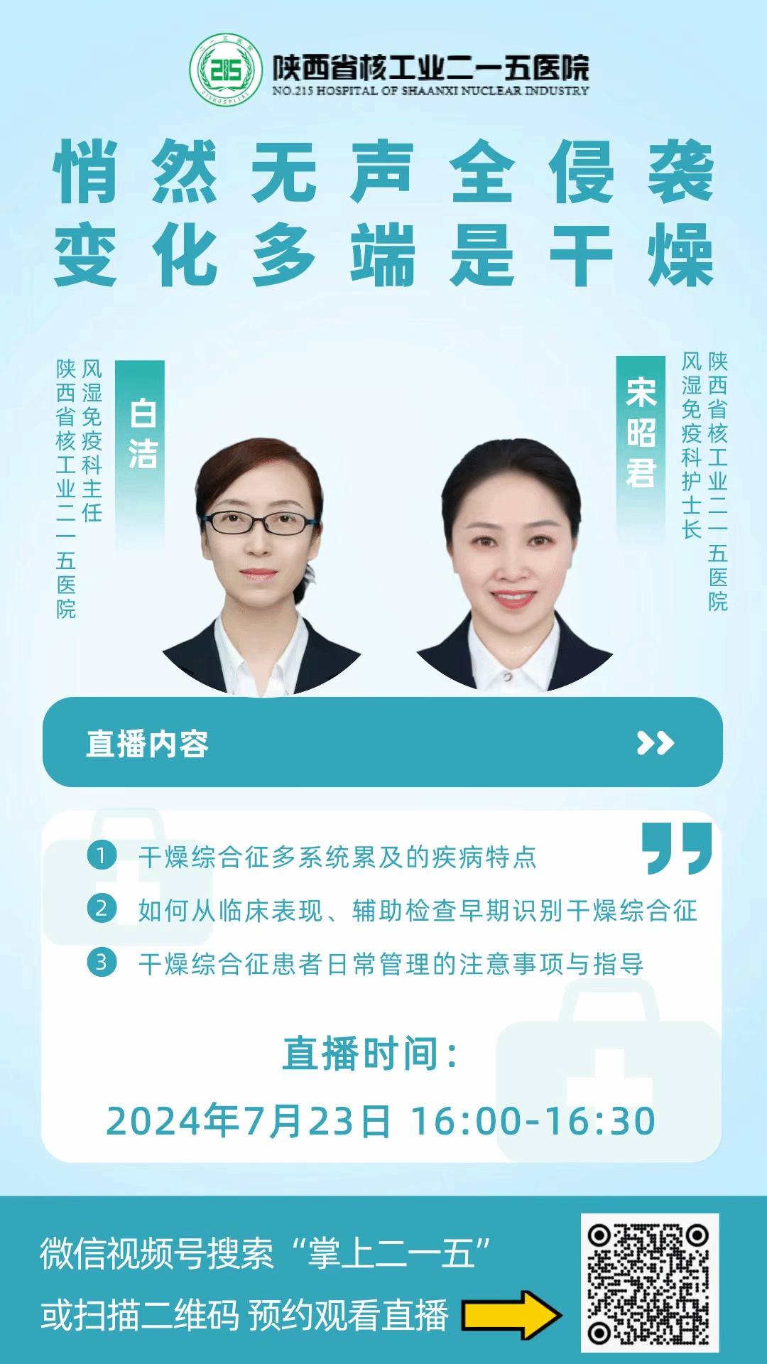 为促进公众对干燥综合征有进一步的了解和认识,提高对干燥综合征的关注度,关注干燥综合征患者的生活和心理健康。7月23日下午,陕西省核工业二一五医院风湿免疫科开展了主题为“悄然无声全侵袭,变化多端是干燥”的线上科普直播讲座,本次线上科普讲座由风湿免疫科白洁主任主讲,内容涵盖了干燥综合征的病因、症状、诊断、治疗及预防等方面,吸引了众多患者、家属的关注。