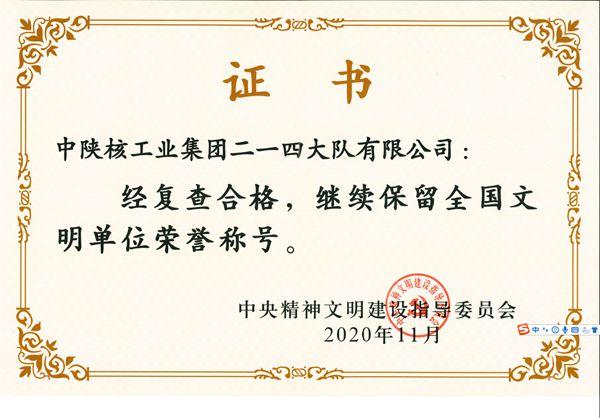 近日,中央精神文明建设指导委员会印发《关于复查确认继续保留荣誉称号的全国文明城市、文明村镇、文明单位的通报》(文明委[2020]9号),二一四大队有限公司经中央文明委复查确认继续保留“全国文明单位”荣誉称号并...
