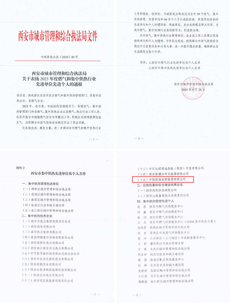 经西安市城市管理和综合执法局综合评审认定,中陕核宜威新能源有限公司荣获“西安市集中供热优秀企业”荣誉称号。 此次殊荣不仅是对宜威新能源保障供热安全稳定所做贡献的高度认可,也是对公司持续在提升服务质量、...