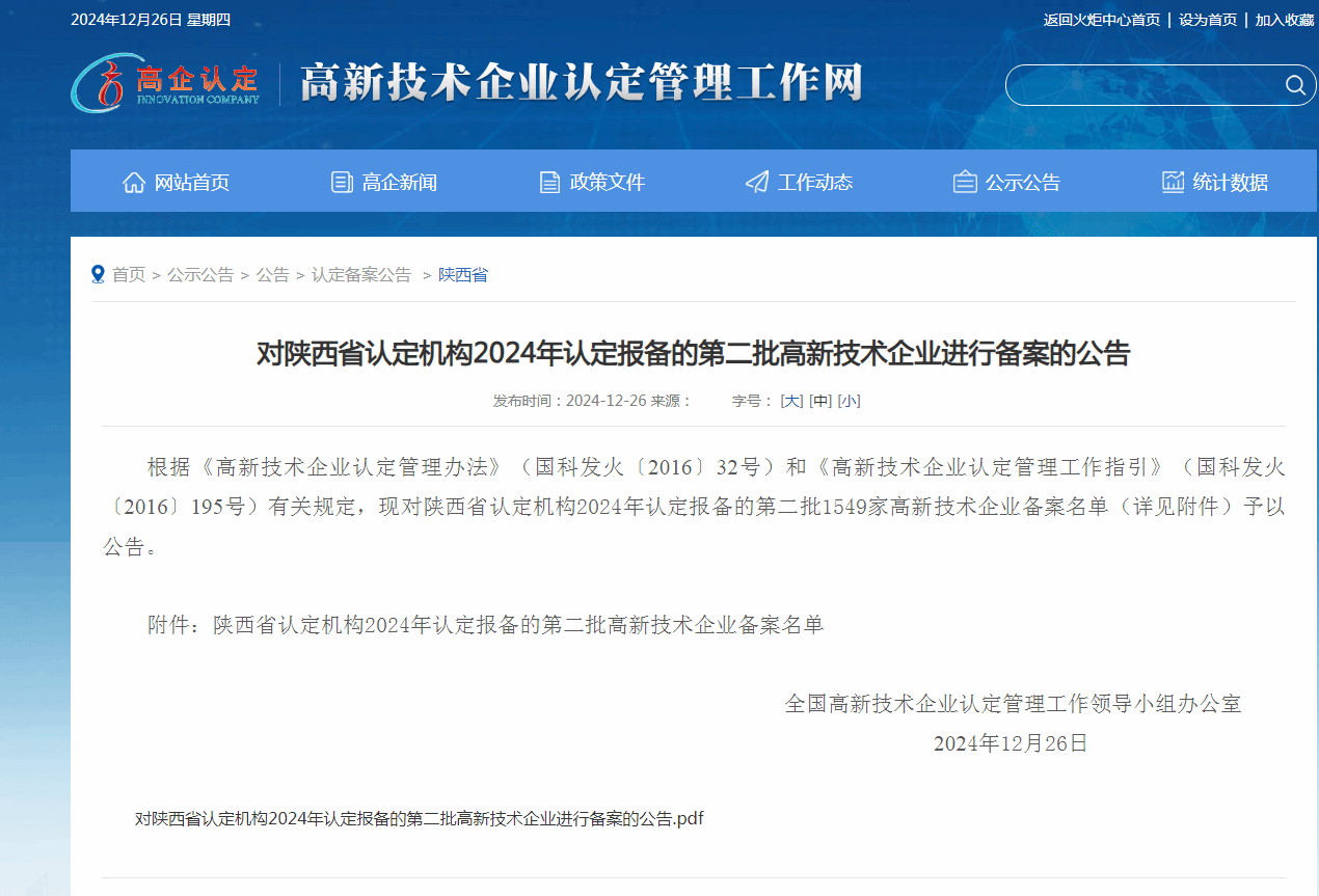 近日,全国高新技术企业认定管理工作领导小组办公室发布了《陕西省认定机构2024年认定报备的第二批高新技术企业备案名单》的公告,秦洲核安顺利通过国家高新技术企业复审。