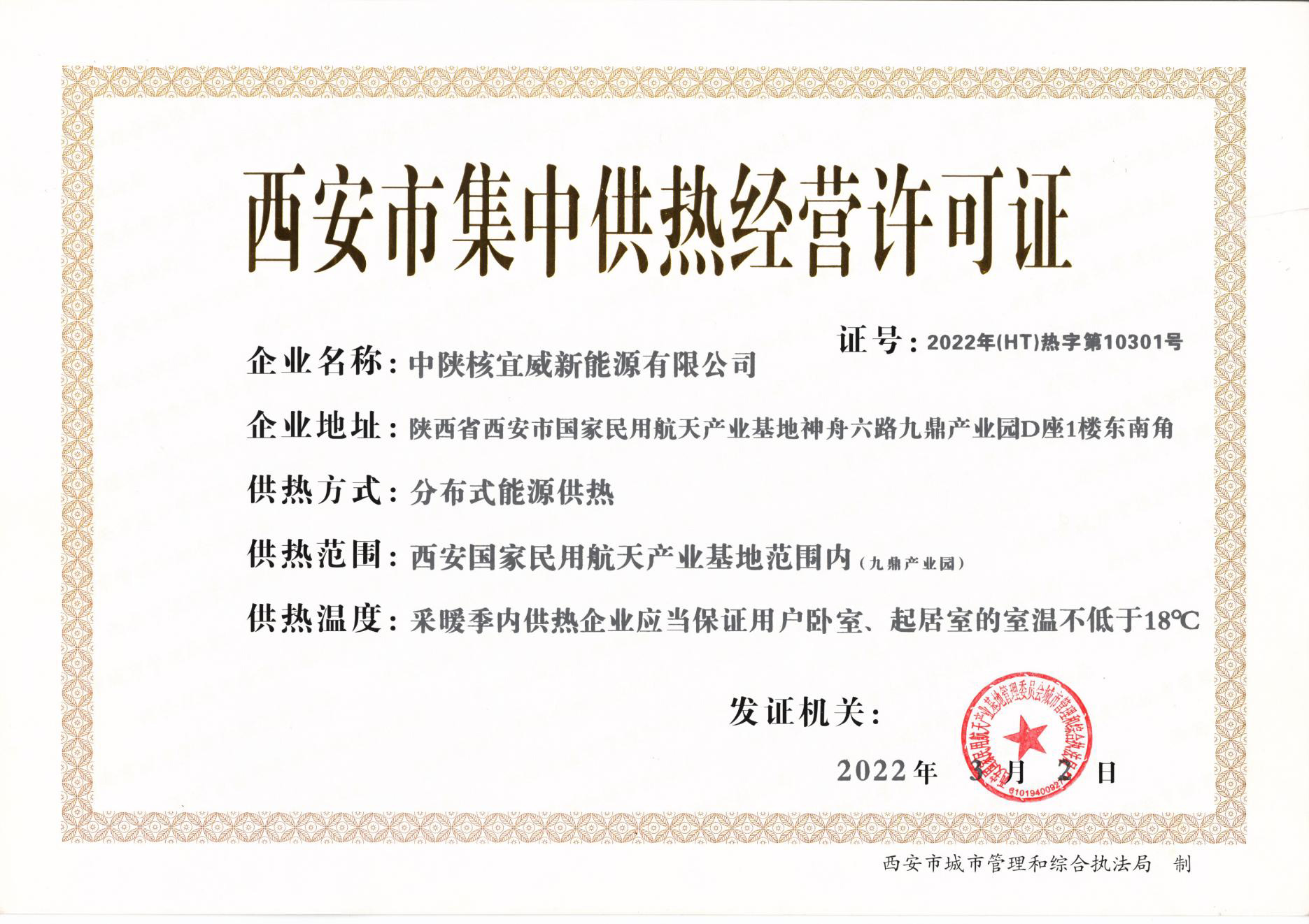 近日,中陕核宜威新能源有限公司顺利取得西安市航天基地城市管理和综合执法局颁发的“西安市集中供热经营许可证”,这是继公司荣获高新技术企业、科技型中小企业认证,完成公司资质升级和安全生产许可证延期后的又一...