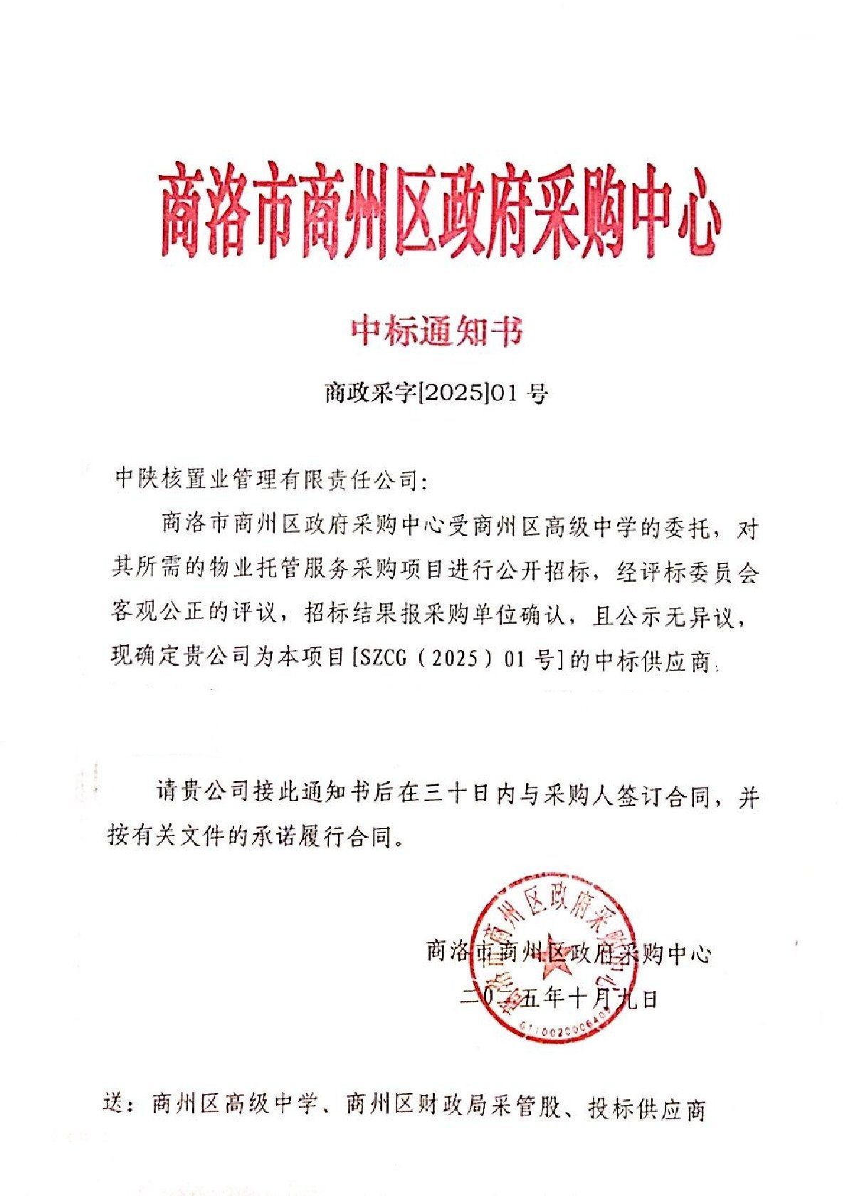 近日,中陕核置业管理有限责任公司传来重磅喜讯:依托置业公司在项目管理中积累的科技赋能经验与"提质增效"发展理念,公司凭借专业的服务方案、完善的应急机制及清晰的岗位分工,成功中标商州区高级中学物业托管服务采购项目。商州区高级中学物业托管项目规模宏大、服务需求多元。该校位于商州区大赵峪街道办事处龙山村,总建设用地332亩,新老校区总建筑面积约14.07万平方米,服务覆盖3491名学生及312名教职工。项目服务涵盖七大核心岗位共76名人员,...
