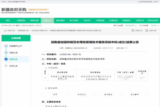 10月13日,新疆政府采购网传来喜讯——中陕核二二四队测绘院有限公司凭借雄厚技术实力、丰富项目经验与卓越市场信誉,在众多竞争者中脱颖而出,成功中标“疏勒县加强和规范农用地管理技术服务”项目。这是继阿克苏地区、喀什地区、阿勒泰地区之后,二二四队测绘院在新疆市场斩获的又一重要项目,标志着二二四队测绘院在新疆区域市场拓展取得实质性突破,也是对二二四队测绘院在自然资源调查监测领域专业能力的高度认可。 据悉,本项目位于新疆维吾尔自治区喀什地区疏勒县,...