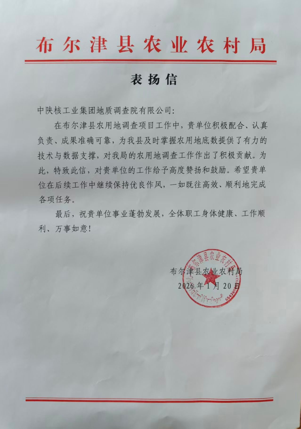 2026年1月20日,地调院收到了一封来自新疆维吾尔自治区布尔津县农业农村局的表扬信。信中对地调院在布尔津县农用地调查项目中作出的突出贡献和展现出的专业能力给予高度认可。布尔津县农用地调查是一项重要的基础性工作,旨在全面摸清县域农用地资源现状,为农业规划、土地管理和相关政策制定提供科学依据。项目执行期间,项目团队展现出高度的专业素养和严谨负责的工作态度。面对地域偏远、环境复杂、任务繁重、时间紧迫以及多部门协调难度大等实际困难,...