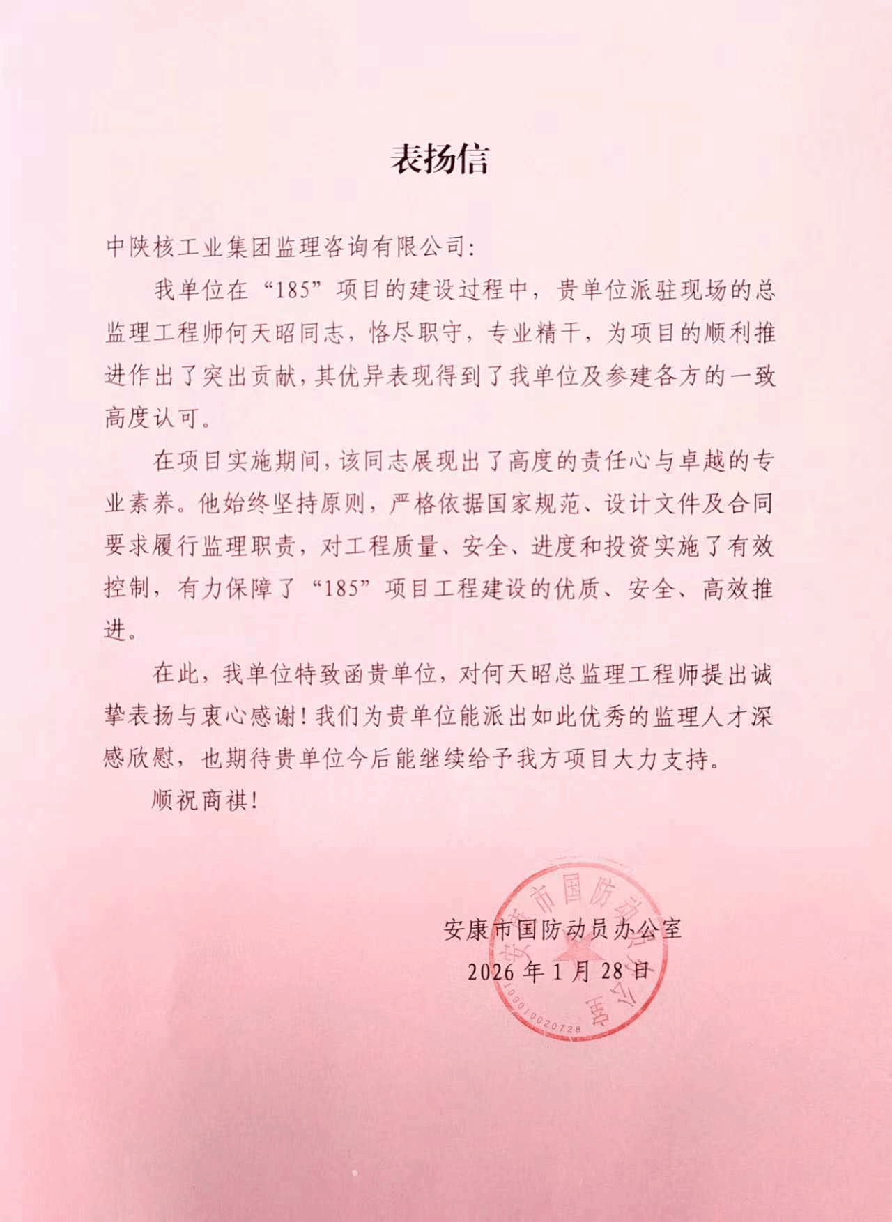 近日,监理公司组织实施的监理项目获安康市国防动员办公室的来信表扬,对项目监理团队的工作给予了高度评价。作为工程建设中的重要监督力量,该项目监理团队始终恪守“诚信、公正、科学、服务”的执业准则,既担当坚守原则、严格管理的“工程卫士”,以专业能力保障工程质量和安全;又扮演用心服务、高效协调的“建设管家”,主动对接各方需求,提供全方位、精细化的监理服务。从盛夏酷暑到严冬寒天,全体监理人员始终坚守施工一线,...