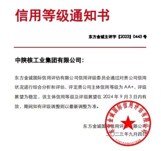 9月4日,经国内权威信用评级机构东方金诚国际信用评估有限公司评定,确定中陕核工业集团有限公司主体信用评级为“AA+”,评级展望为稳定。 近年来,集团公司认真贯彻落实省委、省政府、省国资委的决策部署,持续深...