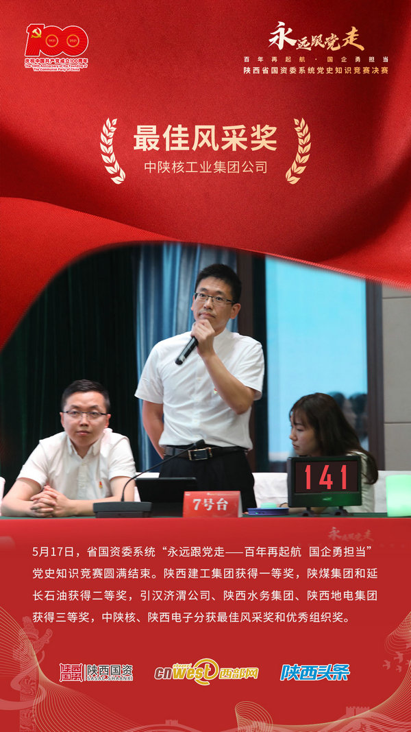 5月17日上午,由省国资委、“学习强国”陕西平台、西部网联合主办,陕西建工集团承办的省国资委系统“永远跟党走——百年再起航 国企勇担当”党史知识竞赛圆满结束。中陕核集团代表队荣获本次竞赛“最佳风采奖”。 本...