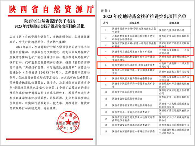 近日,陕西省自然资源厅组织召开新一轮找矿突破战略行动暨2023年地勘基金项目成果交流研讨会。在“2023年度地勘基金找矿推进突出项目”评选中,中陕核集团二一一大队、二二四大队分别组织实施的“陕西省凤县西庄金(...