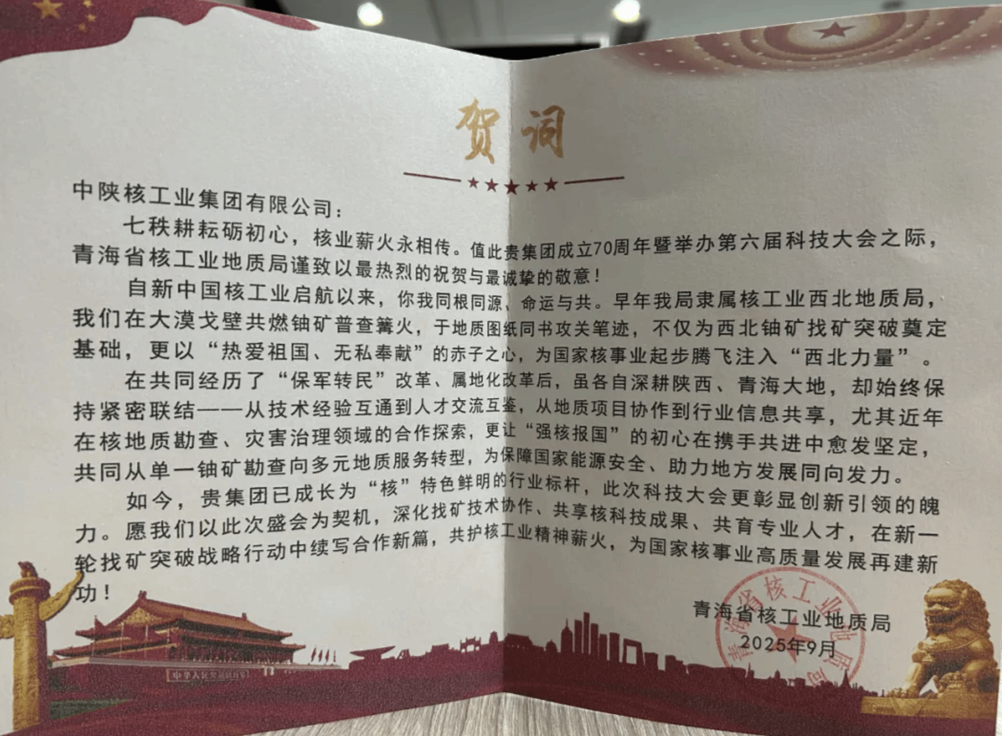 中陕核工业集团有限公司:七秩耕耘砺初心,核业薪火永相传。值此贵集团成立70周年暨举办第六届科技大会之际,青海省核工业地质局谨致以最热烈的祝贺与最诚挚的敬意!自新中国核工业启航以来,你我同根同源、命运与共。早年我局隶属核工业西北地质局,我们在大漠戈壁共燃铀矿普查篝火,于地质图纸同书攻关笔迹,不仅为西北铀矿找矿突破奠定基础,更以“热爱祖国、无私奉献”的赤子之心,为国家核事业起步腾飞注入“西北力量”。在共同经历了“...