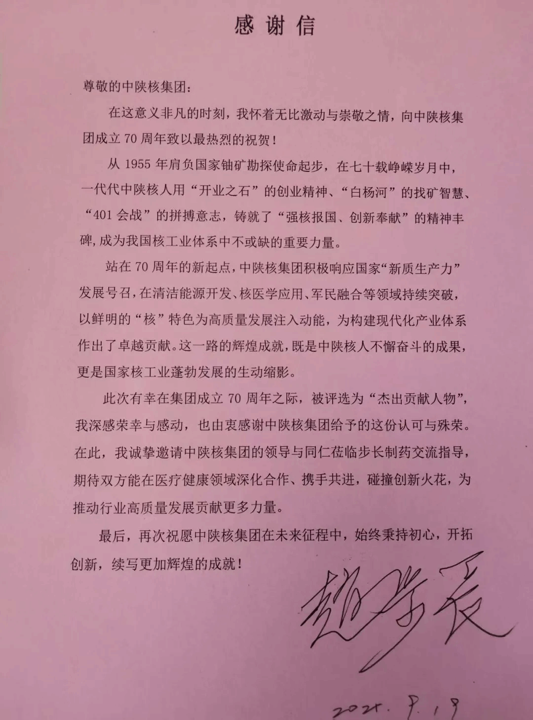 尊敬的中陕核集团:在这意义非凡的时刻,我怀着无比激动与崇敬之情,向中陕核集团成立70周年致以最热烈的祝贺!从1955年肩负国家铀矿勘探使命起步,在七十载峥岁月中,一代代中陕核人用“开业之石”的创业精神、“白杨河”的找矿智慧“401会战”的拼搏意志,铸就了“强核报国、创新奉献”的精神丰碑,成为我国核工业体系中不或缺的重要力量。站在70周年的新起点,中陕核集团积极响应国家“新质生产力”发展号召,在清洁能源开发、核医学应用、...