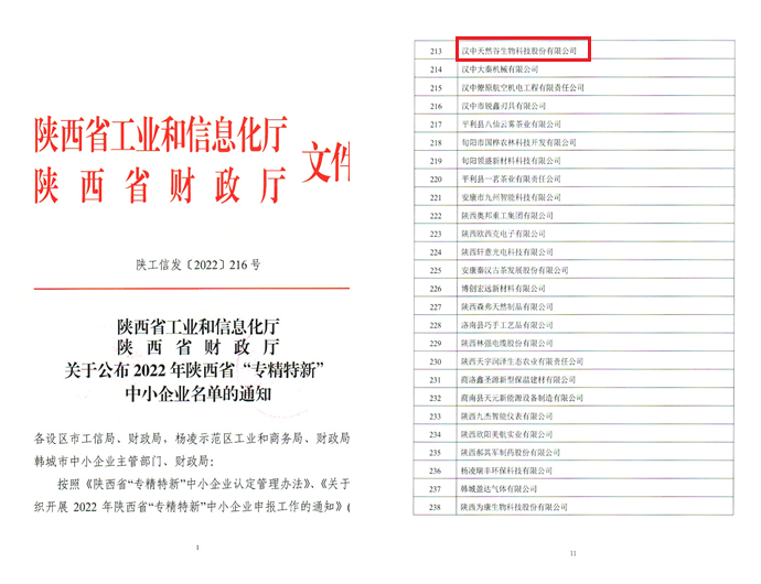 近日,陕西省工业和信息化厅公布“2022年度陕西省专精特新中小企业名单”,汉中天然谷生物科技股份有限公司被认定为陕西省“专精特新”中小企业,这是继天然谷公司从新三板基础层转为创新层后的又一喜讯。 天然谷公...